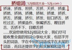 组词大全详解[挢组词]如:挢诬、挢首、担挢、舌挢、夭挢、挢虔、挢然、挢捎、挢拂、挢制、挢揉、挢挢、挢舌、挢掇、挢引、挢发、钳口挢舌、挢枉过正、挢揉造作、张嘴...