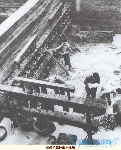 1977年9月,湖北随州城郊的一个小山包上,沉睡于地下2430年后,曾侯乙编钟得以重见天日. 这是中国文物考古、音乐史和冶铸史上的空前发现. 那一天,随州城郊擂鼓墩驻军扩建营房过程中, 偶然发现了曾侯乙墓.这是个面积达220平方米、比长沙马王堆汉墓大6倍的“超级古墓”. 当勘测小组赶到现场时,部队施工打的炮眼距古墓顶层仅差80厘米,只要再放一炮,这座藏有千古奇珍的古墓就会永远不复存在.1978年5月22日凌晨5时,墓室积水抽干后,雄伟壮观的曾侯乙编钟露出了它的真面目,所有在场的人都被这座精美绝伦的青铜铸器惊呆了:历经二千四百多年,重达2567公斤的65个大小编钟整整齐齐地挂在木质钟架上. 曾侯乙编钟 出土现场