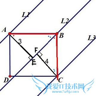 如图,作AE⊥L2 CF⊥L2 则AE=3 CF=4 又⊿AEB≌⊿BFC﹙ASA﹚ ∴BE=CF