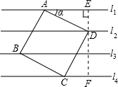 问题1:如图,已知直线l1∥l2∥l3∥l4,相邻两条平行直线间的距离都是1,如果正方形ABCD的四个顶点分别在四条直线上,则sinα=______.[数学科目]