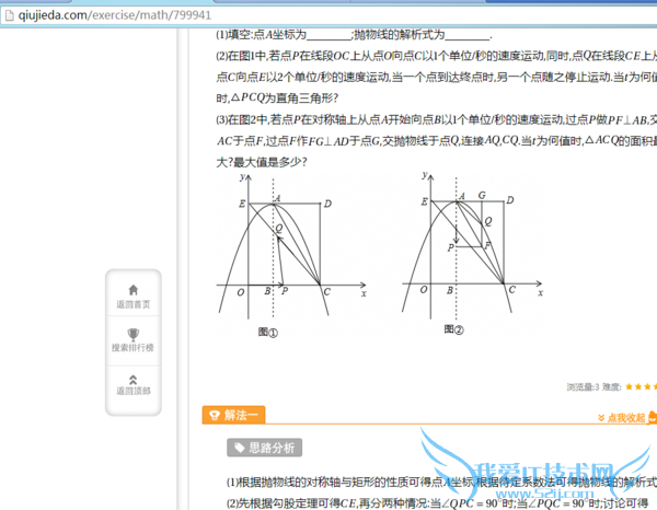 题目虽然不长,但是难度非常大,又放在最后面,真的很考验我们的心态和解题能力啊,确确实实是一道压轴题,这里就是答案哦http://qiujieda.com/exercise/math/799941在平面直角坐标系中,矩形OCDE的三个顶点分别是C(3,0),D(3,4),E(0,4).点A在DE上,以A为顶点的抛物线过点C,且对称轴x=1交x轴于点B.连接EC,AC.点P,Q为动点,设运动时间为t秒.