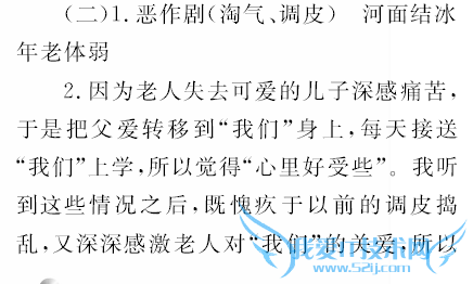 2.老人为失去可爱的儿子而深感痛苦,于是把父爱转移到“我们”身上(把“我们”当作自己的儿子),每天接送“我们”上学,所以觉得“心里好受些”.(言之有理均可.语言表达不清的要扣分)先要分析摆渡老人为什么心里不好受,再分析他这样做“心里好受些”的原因,这道题就能答得比较圆满了.第5段中“那双眼中竟满含着期望和爱意”这句话,也提示摆渡老人“心里好受些”的原因.